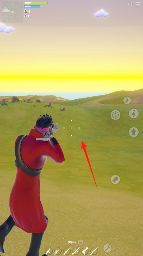 你需要操控那个穿着红色风衣的角色,借助右侧的虚拟按键来完成移动、射击和跳跃动作,在一片绿意盎然的旷野场景中展开行动。