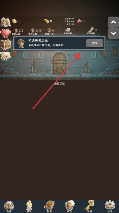 进入游戏后,找到并点击地牢区域,接着完成“初遇勇者之光”这个任务,然后召唤出勇者,就能开启属于你的冒险之旅了。