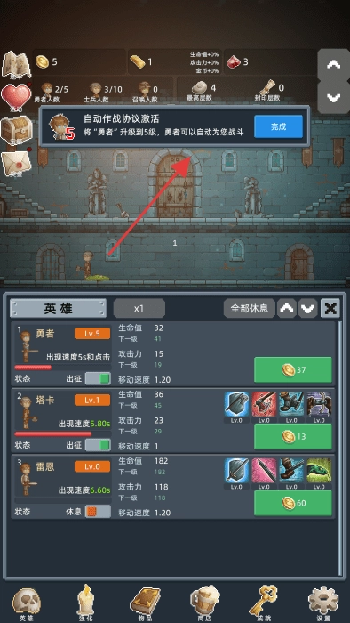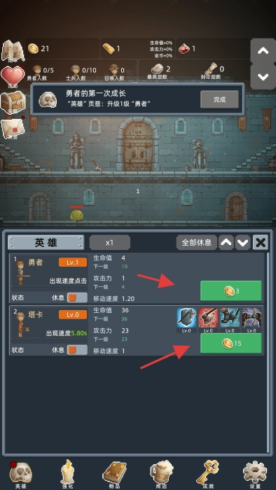 在英雄界面中,玩家可以消耗金币对勇者以及塔卡这类伙伴进行升级操作,以此提升他们的生命值、攻击力等各项属性,进而增强整体的战斗能力。