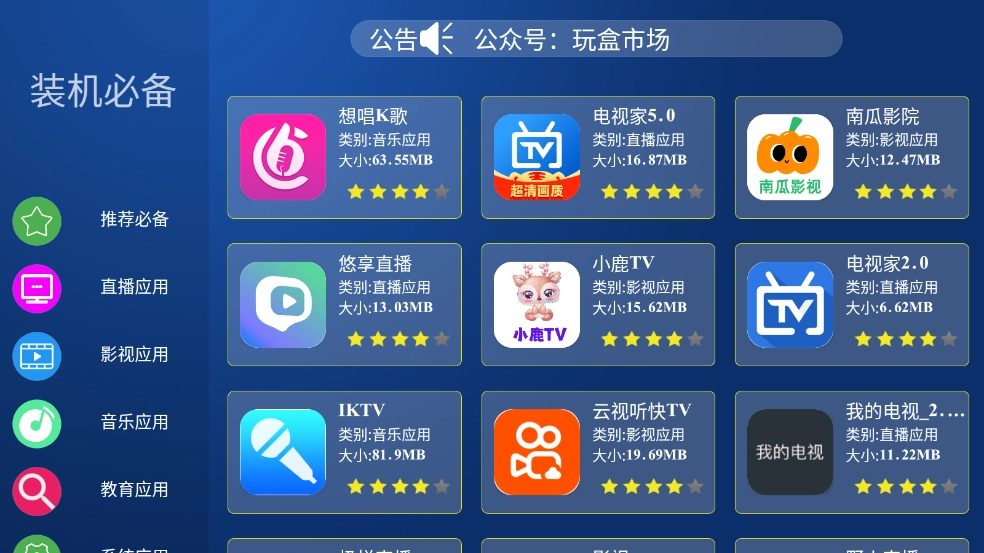 玩盒市场电视版这款软件,整合了丰富多样的优质电视应用资源,涵盖学习、影视、音乐等多个类别。平台上的每一款应用均为当下最新且热门的资源,并且通过超详细的分类设置,助力用户更便捷地找到所需内容。同时,软件还在持续进行更新与优化,确保用户每次使用时都能获取到最新的资源。