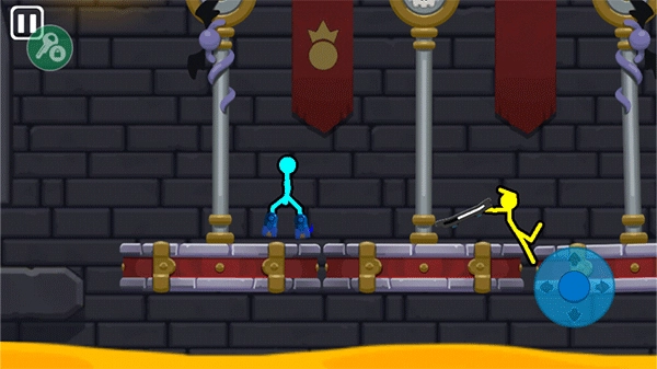 在对战过程中,蓝色火柴人一旦受到攻击就会触发绿色特效,玩家需要操控它进行移动,以此躲避黄色火柴人的攻击。