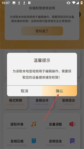 当弹出存储权限的温馨提示窗口时,请点击【确认】按钮,这样就能获取设备的媒体存储权限,以便继续进行后续操作。