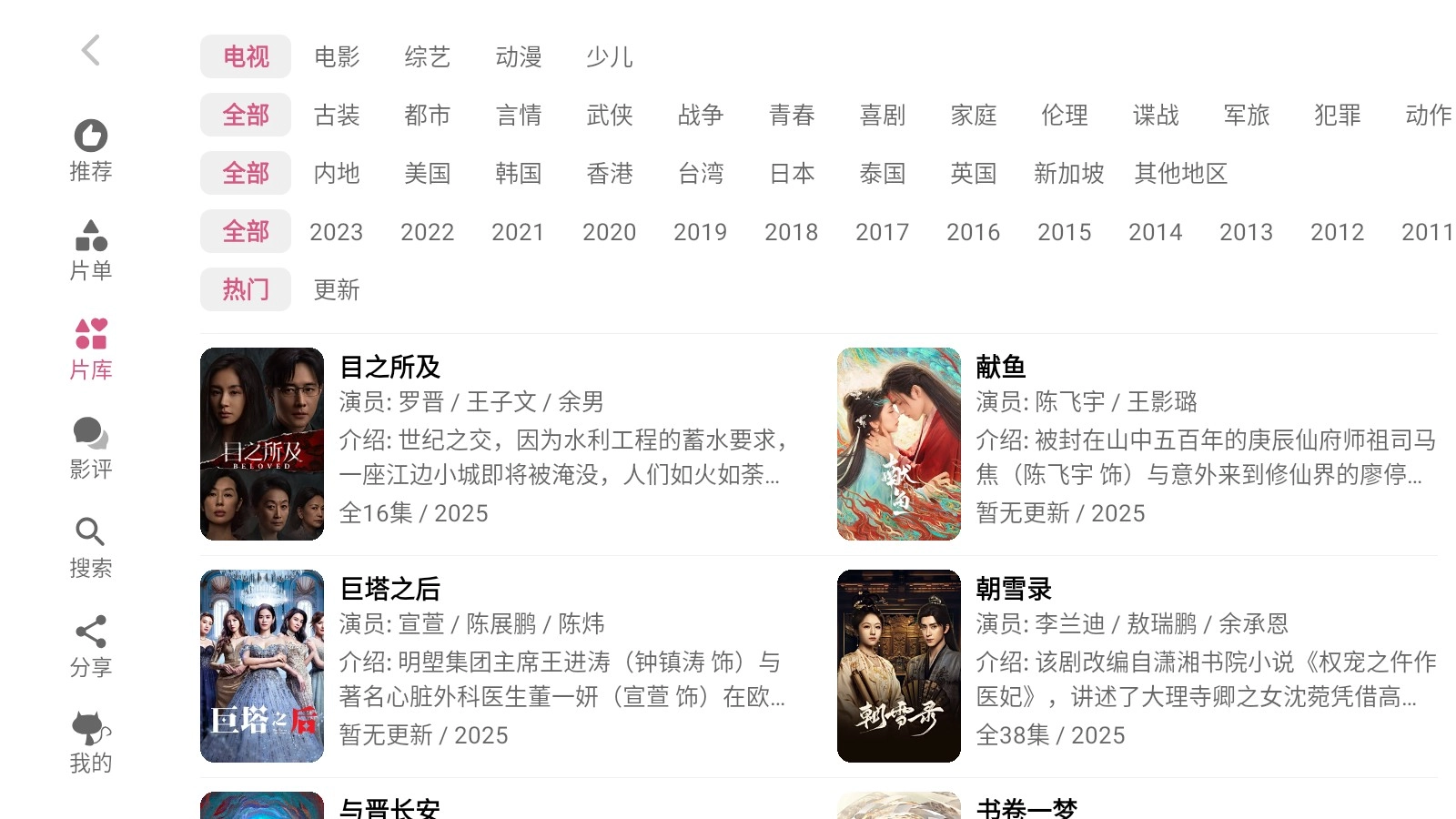 点击片库按钮后,可依据不同条件进行筛选,从而找到你感兴趣的影视剧作品。