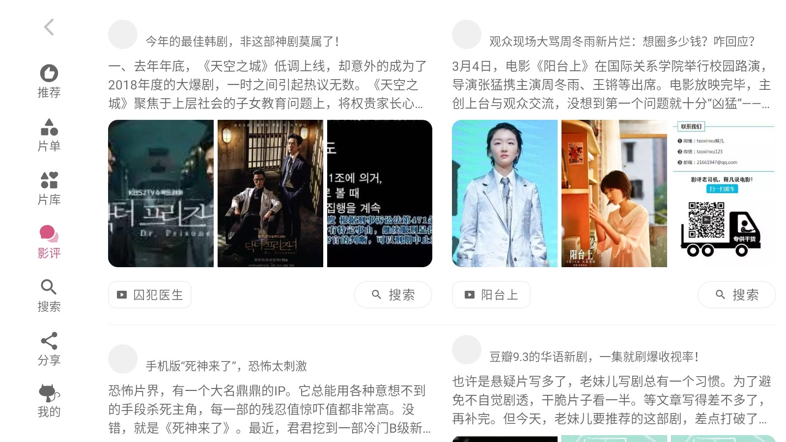 点击影评按钮后,在当前页面就能浏览到各类影视剧的最新影评内容
