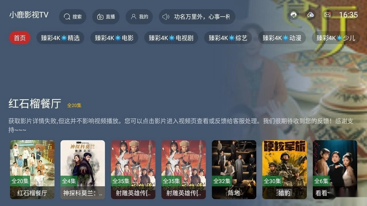 小鹿影视TV宛如一座内容丰富的影视宝库,汇聚了海量的影视资源,覆盖了各种题材,不管是紧张刺激的动作片,还是温情脉脉的文艺剧,都能轻松找到。