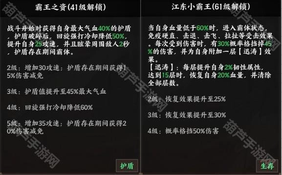 技能效果:获取自身气血特定数值的护盾,当护盾破裂后,回旋强打技能会缩短冷却时间,同时提升攻击速度并使敌人眩晕。技能4:江东小霸王[生存]