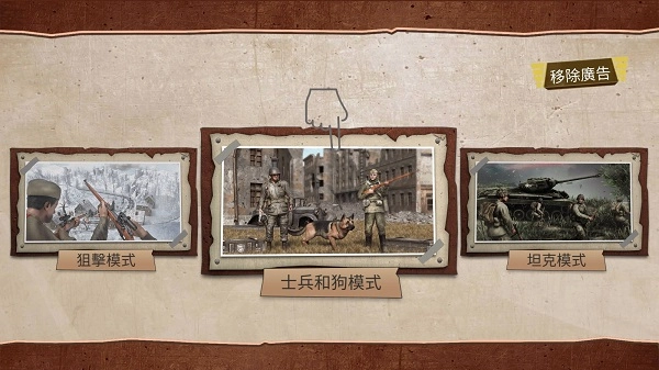 游戏内设有三种模式,分别是狙击模式、士兵与狗模式,还有坦克模式。