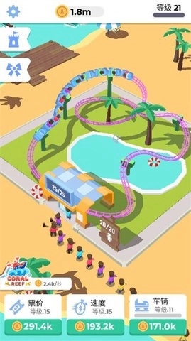 独特的游戏玩法能吸引玩家前来体验经营过山车带来的紧张刺激与快乐休闲;--融合了成人世界的商业元素与儿童世界的玩乐元素,老少皆宜,吸引不同年龄段的玩家;--轻松有趣的放置玩法,玩家可通过简单放置获取丰富资源,助力游戏体验。