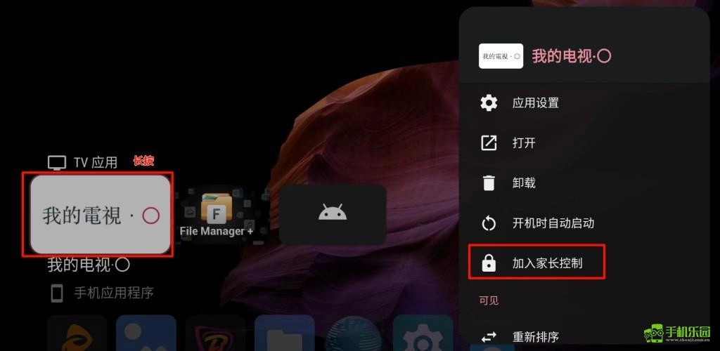 可以对特定应用进行设置,限制家里小孩无法打开使用,在桌面找到应用图标并长按OK键即可添加相关限制。