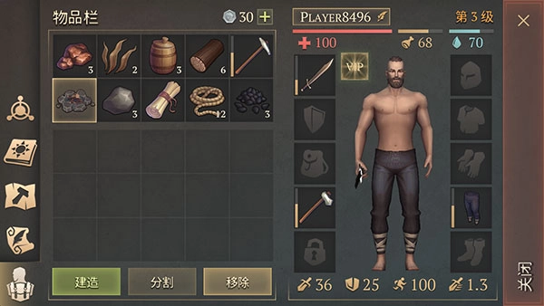 真实生存压力:饥饿、口渴、寒冷会直接致命,砍树挖矿要算体力,背包负重还会影响移速,硬核程度堪比《黑暗之魂》。