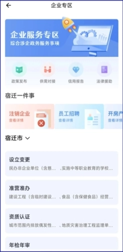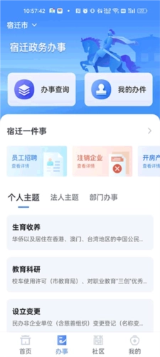 若需查询宿迁的政务办事,可先点击下方的办事按钮,接着点击办事查询即可;右侧的我的办事按钮,还能查看自身事件的办理情况。