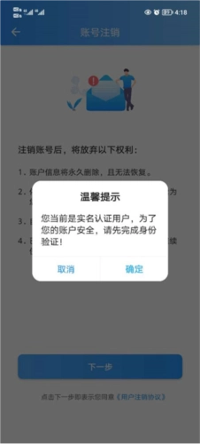 当弹出下方提示框时,点击“确定”完成注销操作,之后重新注册就能修改实名认证信息了。