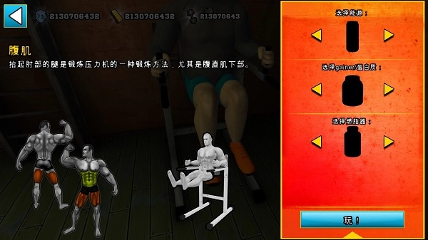 点击这个按钮即可开启当前可进行的锻炼项目,图中展示了具体的锻炼类型。针对不同的锻炼项目,系统会呈现详细的数据信息,以锻炼腹肌为例,不仅配有动作示意图,还提供了相关道具的使用选项,具体如图所示。