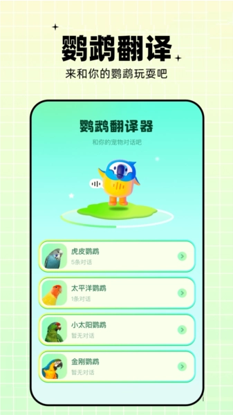鹦鹉交流器是一款专为养宠人士设计的宠物交流翻译工具,帮助用户轻松与宠物沟通,洞悉宠物的想法和行为;应用内包含多种实用功能,用户可快速翻译猫咪和狗狗的叫声,理解其含义,实现顺畅交流;通过软件提供的各类宠物小工具,用户能了解宠物的行为状态,掌握健康情况,及时为宠物提供必要的照顾;此外,用户还能找到丰富的逗宠内容,借助语音包更轻松地与宠物互动,提升养宠乐趣;快来试试这款软件,让与宠物的交流更轻松,养宠生活更有趣。