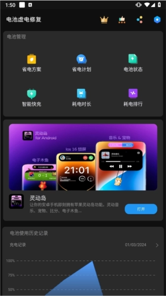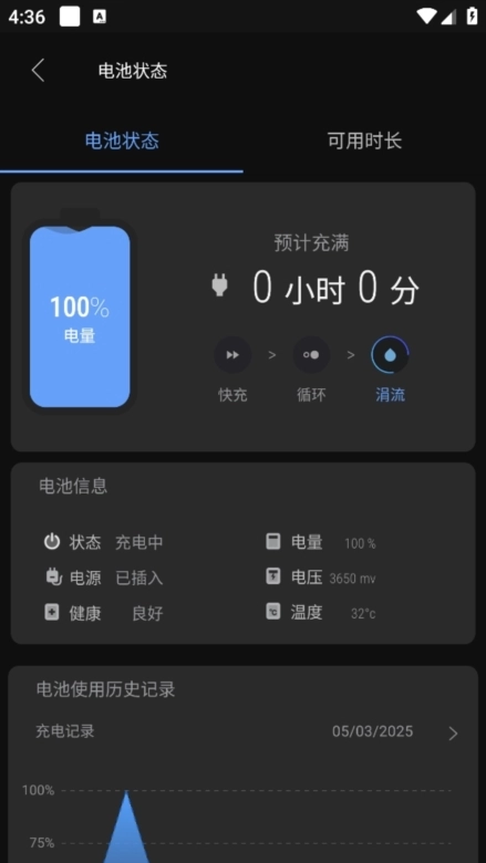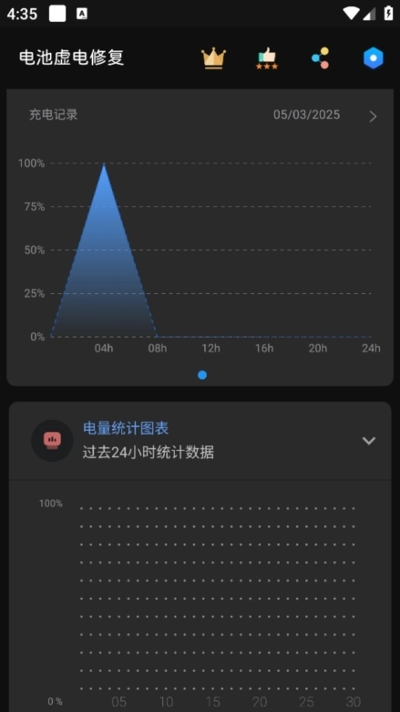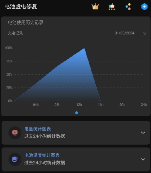在电池虚电修复应用的下方,你能够查看电池的使用记录、电量统计表,还有电池温度统计表。