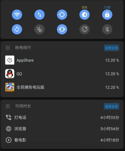你也能够一键开启或关闭手机上的各项组件功能,像WIFI、蓝牙、调节屏幕亮度等,还可以查看各类应用的耗电情况排名。