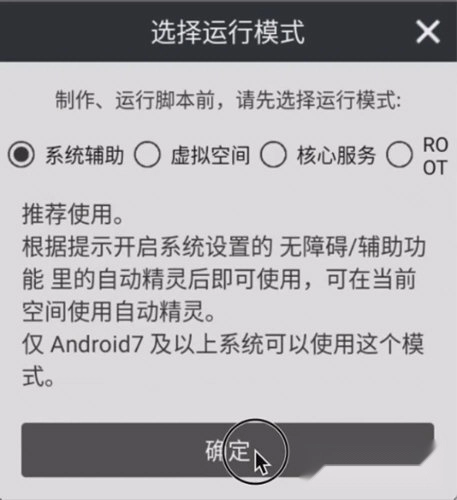 首先我们进入自动精灵的主界面,接着会出现运行模式的提示,这里建议选择系统辅助模式。