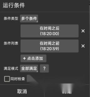 如果希望脚本在18点20分执行,那么需要在脚本的首个动作中添加一个运行条件,具体为多个条件的组合。