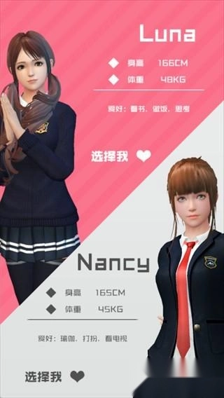 游戏里有Luna和Nancy两位能互动的角色,Luna喜欢阅读、烹饪,性格比较安静;Nancy热衷于瑜伽、美妆,风格更活泼,玩家可以根据自己的喜好进行选择,之后通过互动还能解锁不同的剧情线。