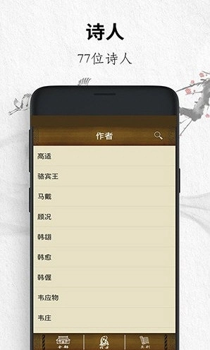 软件的搜索功能支持随时检索作者与诗歌类别,目前已收录唐代77位诗人的作品。