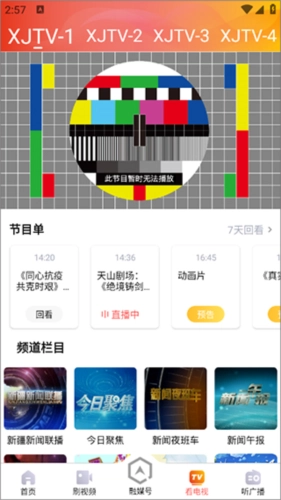 打开新疆广播电视台的丝路视听客户端,接着点击底部导航栏里的“看电视”选项。