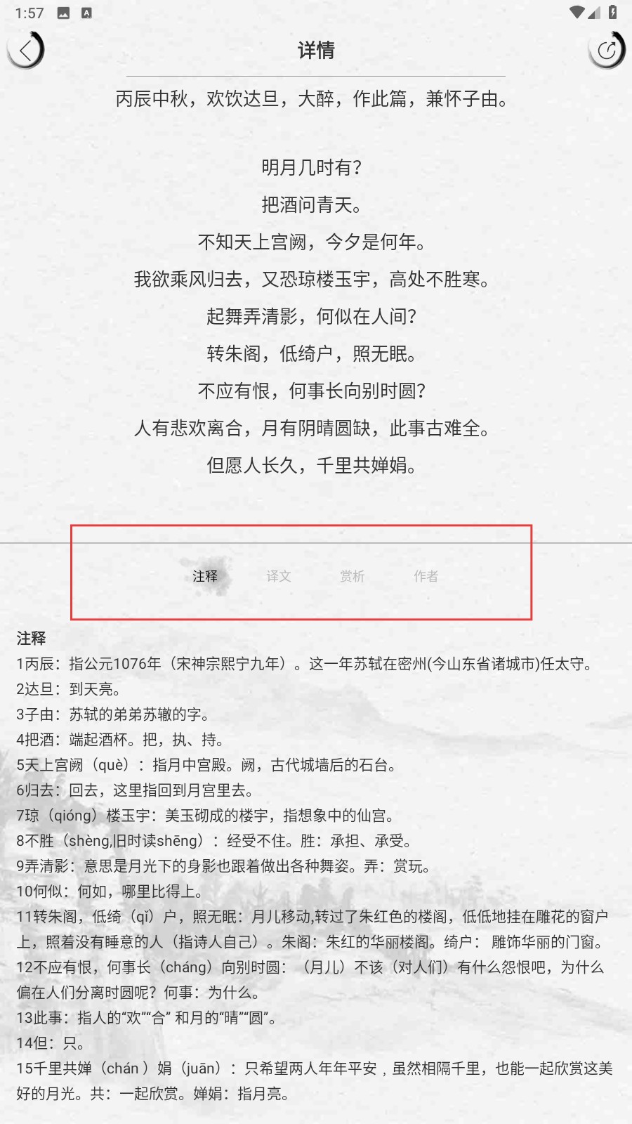详情页设有【注释】【译文】【赏析】【作者】等切换选项,方便用户了解诗词相关信息。