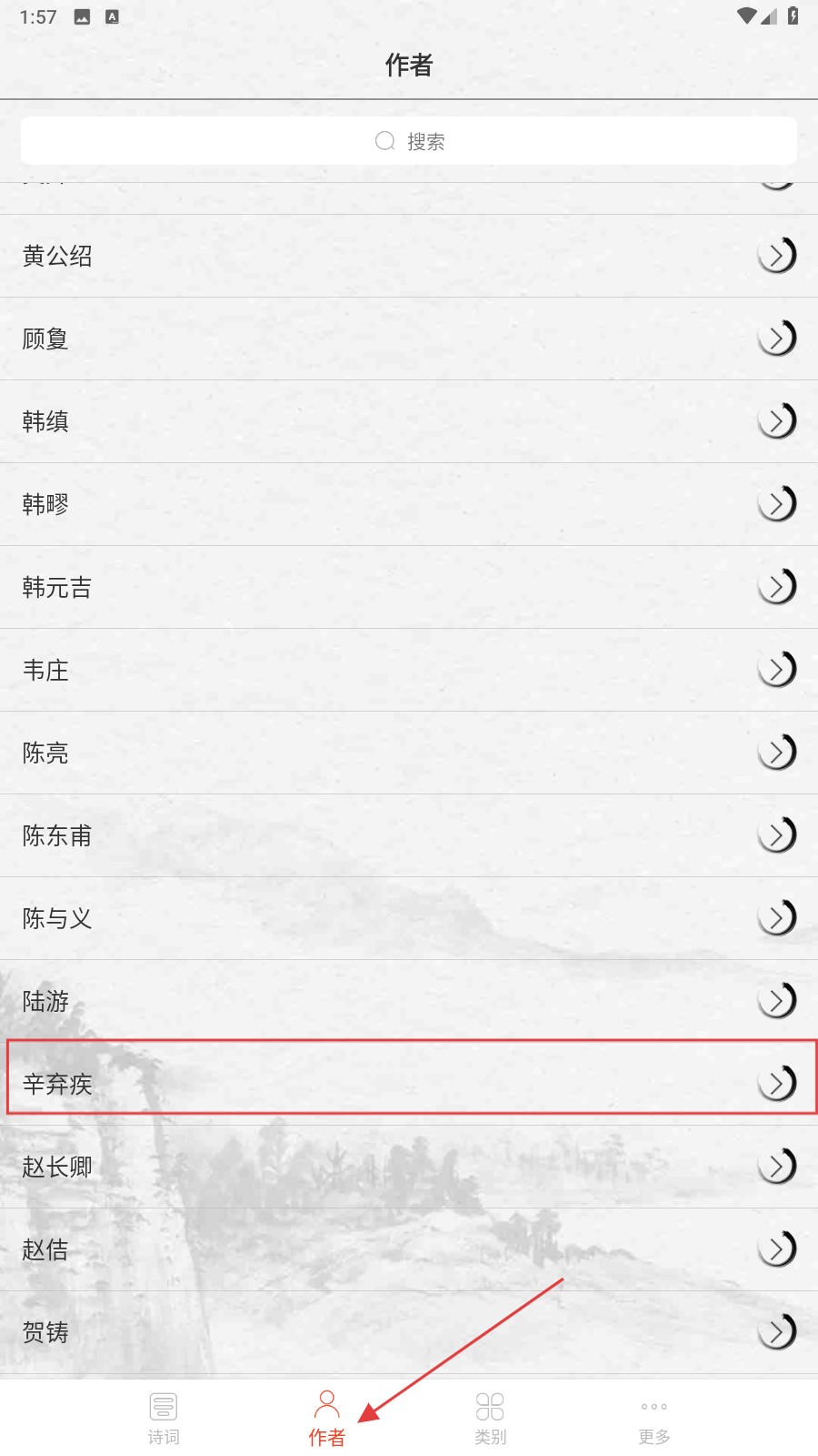 点击页面底部的【作者】按钮,就能进入作者列表页面,进而查看相应作者的诗词作品。