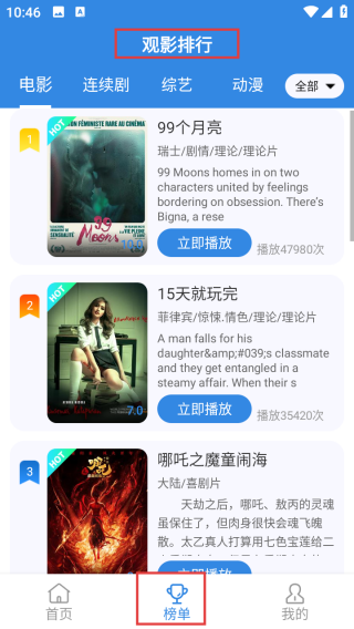 进入【榜单】页面,查看电影、连续剧等分类的观影排行,挑选影片进行播放。