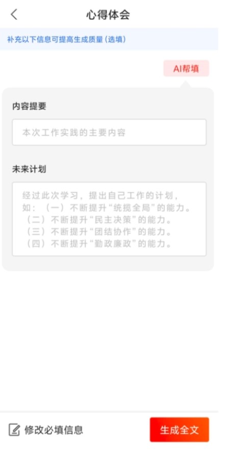 点击左下角的“补充选填信息”按钮,即可对选填信息进行编辑操作。在“心得体会”这一选填板块中,您可以填写内容提要以及未来计划等相关内容。