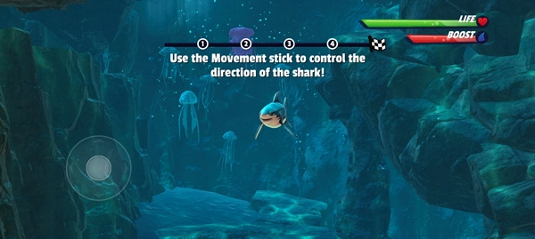 5、过完新手教程后就可开始游玩了,玩家可操纵鲨鱼吞噬小鱼,当下方能量条满后还可获取加速度,获取更多分数;