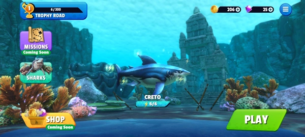 4、逐步解锁更多水下凶猛巨兽,如灰鲭鲨、锤头鲨、虎鲨,还有堪称无敌的大白鲨!