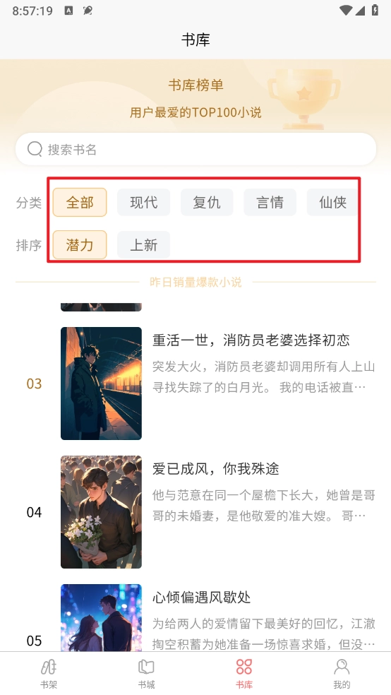 进入软件,在书库页面根据题材选择喜欢的小说。