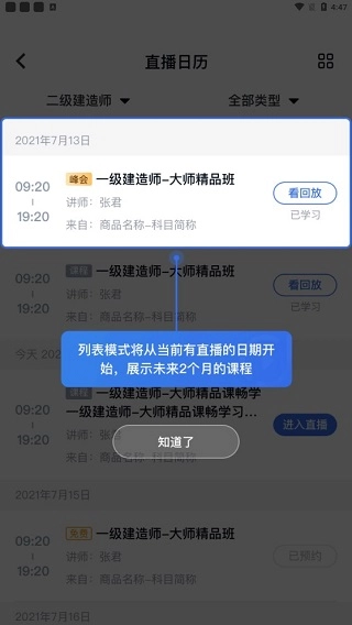 请注意右上方的日历功能对用户非常有用,其中列表模式会从当前有直播的日期起,呈现未来两个月内的课程。