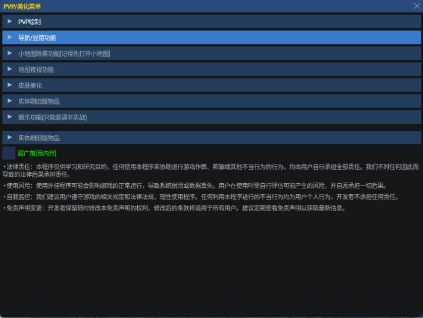 提供PVP场景绘制、小地图除雾、全局夜视功能,可自定义除雾区域范围及显棺透明度参数。