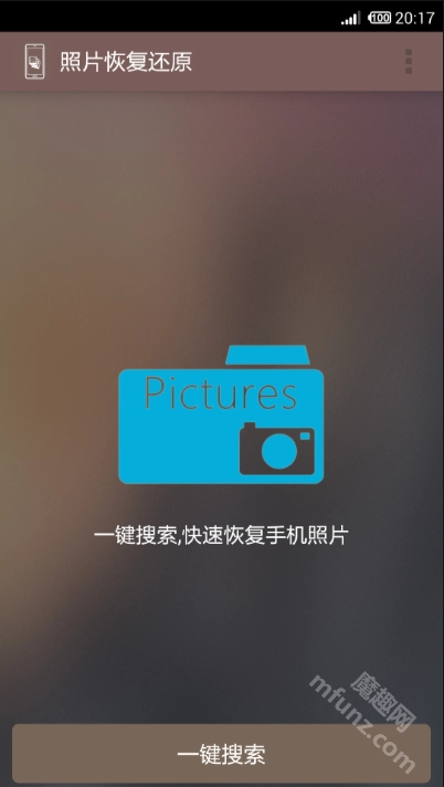 在魔趣网(m.mfunz.com)下载并安装照片恢复还原软件后,打开软件进入首页,找到并点击“一键搜索”按钮。