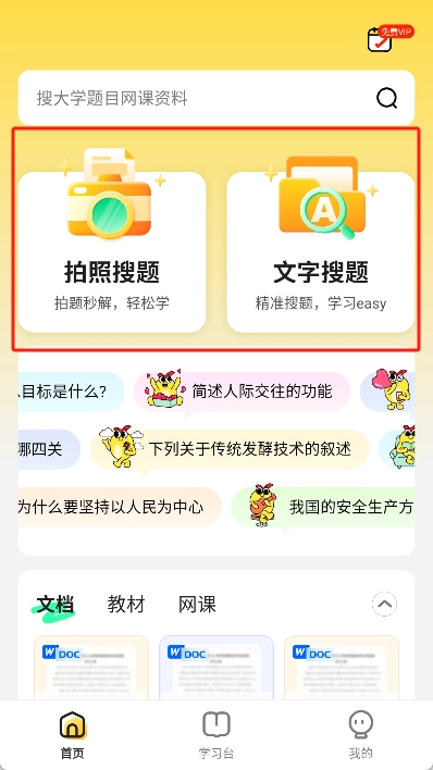 - 搜题、文档、课程、教材:整合大学各类学习资料,一键搜索就能获取所需信息。