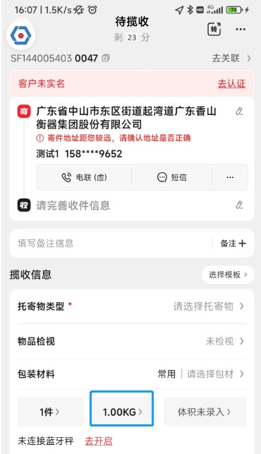 选择蓝牙秤后会跳转至对应界面,界面上会显示“已连接蓝牙秤”;此时将揽收物品放置在秤上,待重量稳定约1秒后,重量数据就会传输给顺丰小哥。