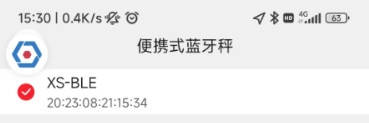 以下为蓝牙秤连接界面,选择“便携式蓝牙秤”,跳转界面,将显示手机搜到的蓝牙设备名称和地址,选择“XS-BLE” ,再点击确定。(蓝牙秤名称和地址,秤仪表后侧有印)