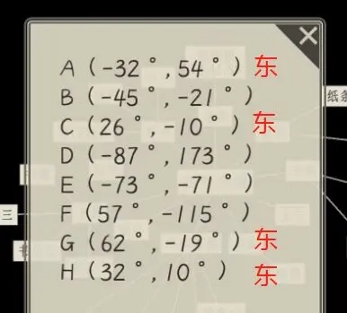 根据书页一三的提示,东为正、西为负,经度要写在后面;另外还有个纸团线索可不能忽视(我之前就因为忽略了它走了不少弯路)