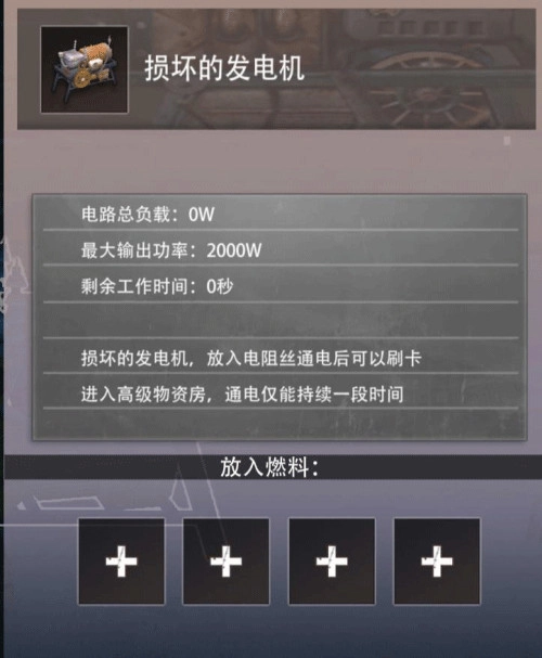 发电机:辐射芯片房的电源需靠它来“刷”,启动前得先放置电阻丝;运行时会消耗电阻丝以获取电能,日常也能用于家庭照明供电。