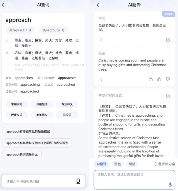 除了全科答疑外,在英语学习方面有道小P也进一步结合学生对单词记忆、语境理解、作文润色等需求,打造了AI查词、AI翻译两大功能。