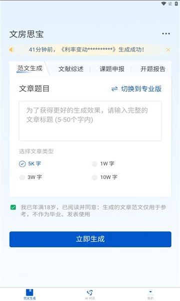 进入首页后,可选择范文生成、文献综述、课题申报、开题报告等功能。