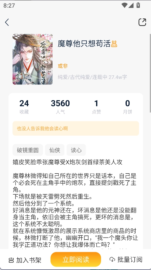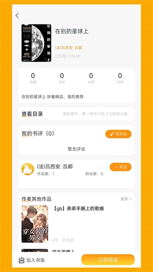 查看书籍详情:在书籍详情页面查看目录、评价等内容,根据这些信息选择喜欢的小说进行阅读。