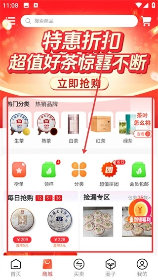 在商城页面点击【分类】选项,即可进入商品分类页面,找到各类茶叶与茶具商品。