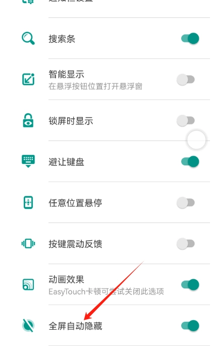 进入高级设置界面,找到“全屏自动隐藏”选项,把它对应的开关打开,这样就能隐藏easytouch图标了。