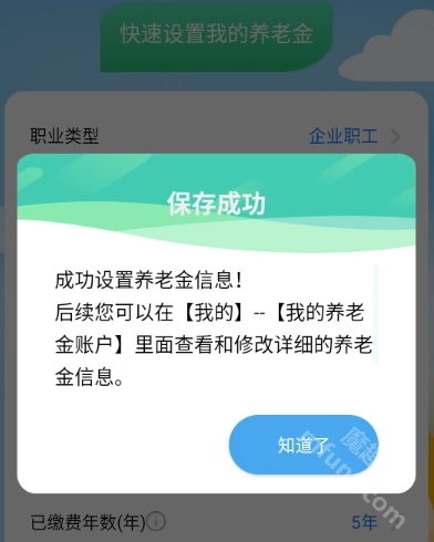 保存成功后系统会给出提示,之后我们可以通过【我的】-【我的养老金账户】入口,查看并修改具体的养老金详细信息。