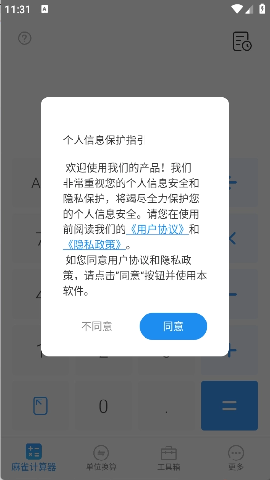 首先在本站完成麻雀计算器的安装,打开软件后,请同意隐私政策和用户协议。