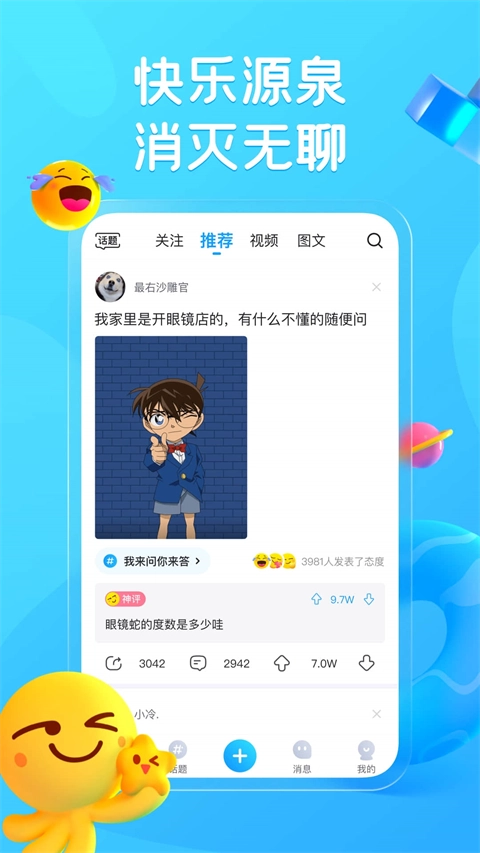 文字、视频、图片,百万种表达方式任你挑选。热门神帖、搞笑GIF图,让你笑到肚子疼!