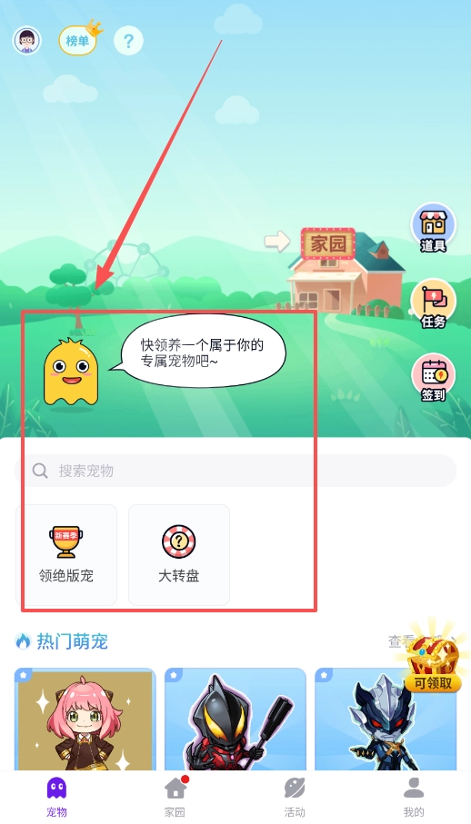 二、若想领养宠物,只需切换至宠物页面。你既可以直接搜索心仪的宠物,也能尝试领取绝版宠物或参与大转盘活动碰运气,各类热门萌宠都在此静候你将它们带回家。