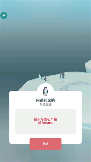 阿德利企鹅创造完成,金币与爱心产量增加150%。